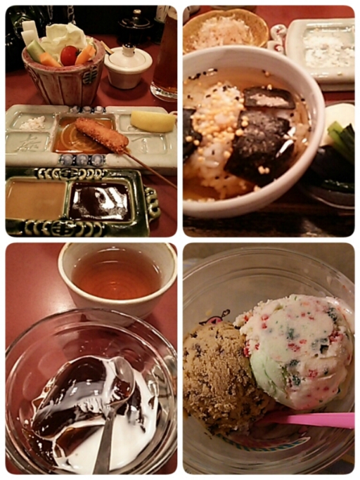 やたらいっぱいの串カツ、お茶づけ、デザートのコーヒーゼリー。一人5,000円。高いねー(笑)